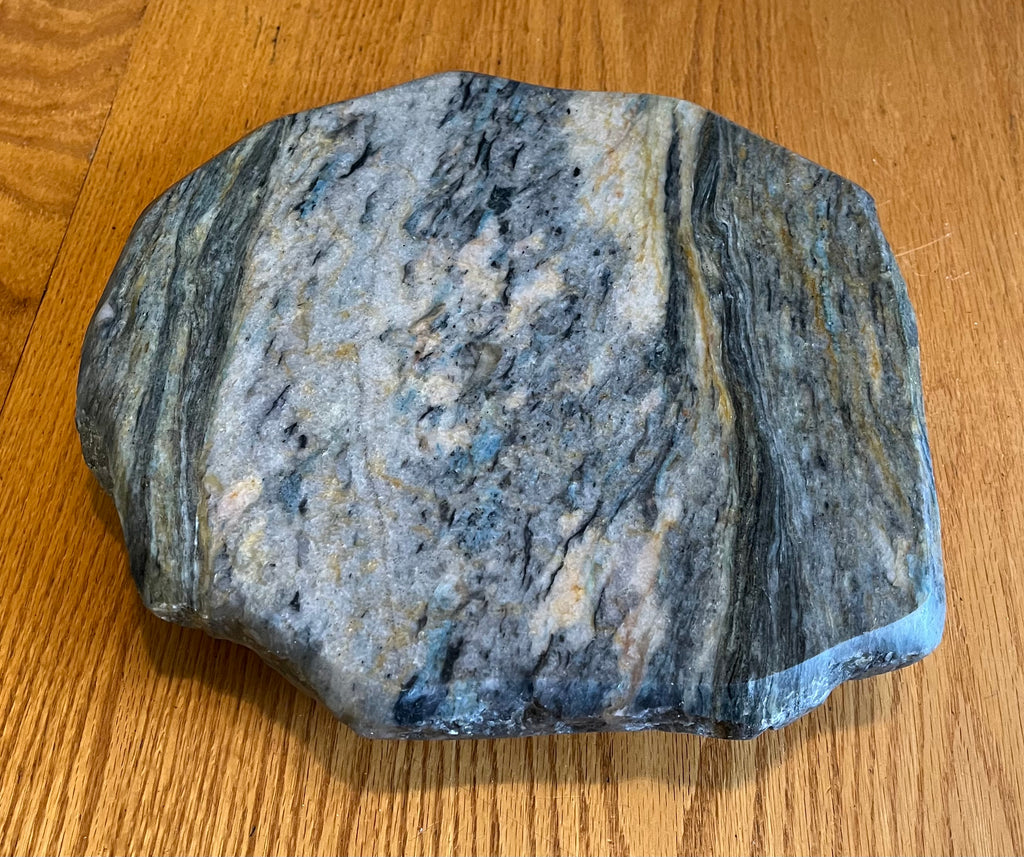 Quartz Lazy Susan with a .75” reclaimed hardwood bottom, 11.5” length x 10.5” width x 2.25'' height. This piece is heat resistant up to 500 degrees.