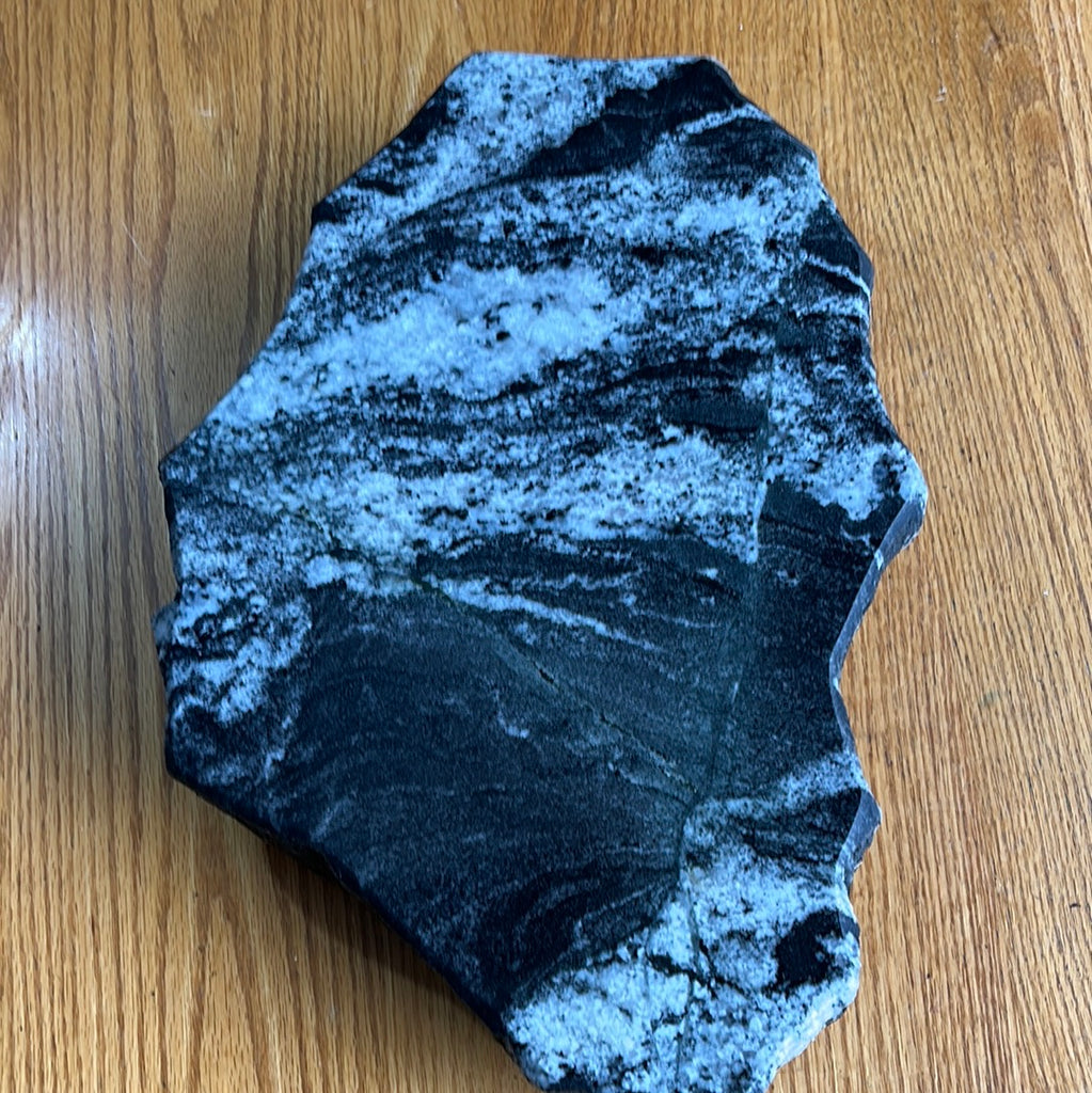 This is a beautiful handcrafted granite Lazy Susan, with blacks white and tans  running through it,…. with maybe even a tinge  of some light green.